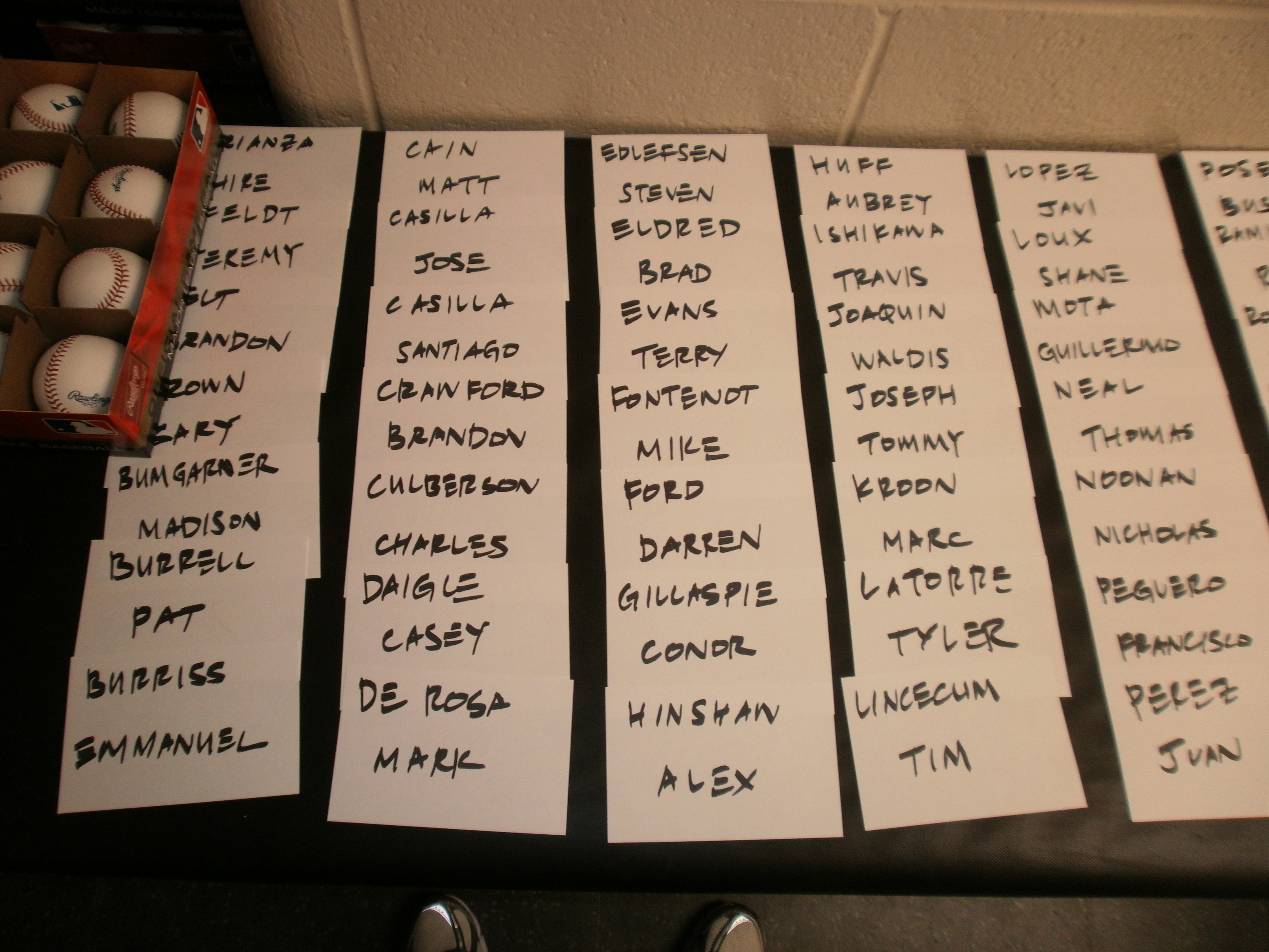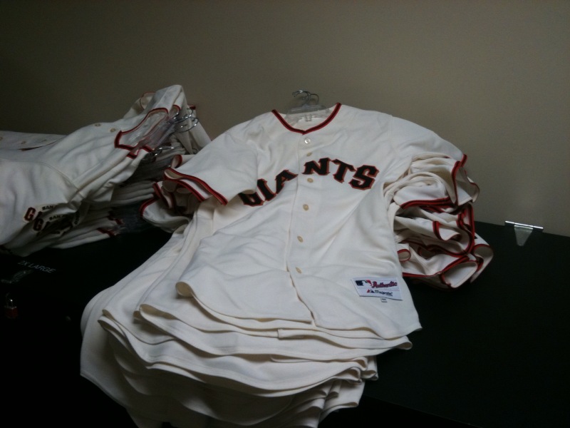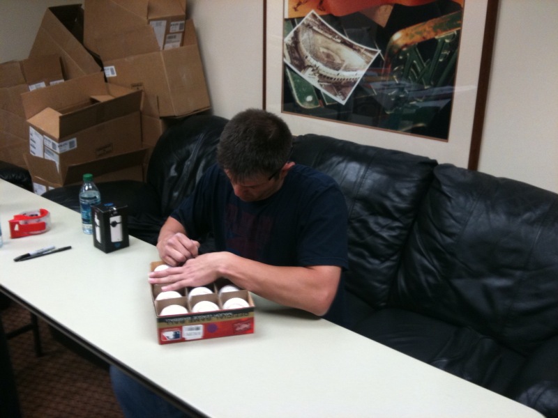 How much does a player have to sign? Well, this year, Tim Lincecum has 25 dozen baseballs, 10 bats, 39 jerseys and 53 photos. He usually spreads it out over a couple of days so he’s not spending a ton of time signing. Buster Posey wins the award for having to sign the most stuff this spring, as he has 31 dozen baseballs, 82 bats, 47 jerseys and 62 photos, by far the most of any Giant.