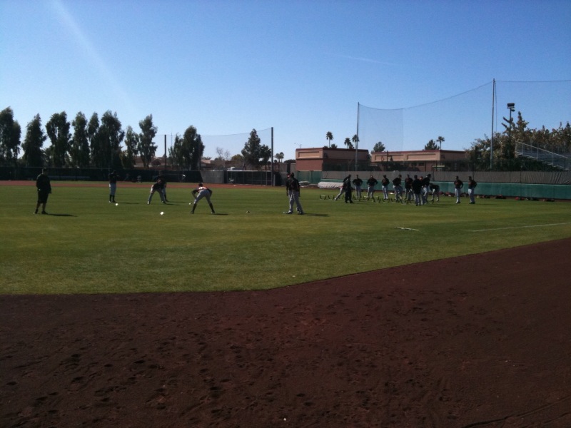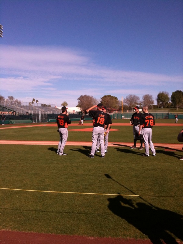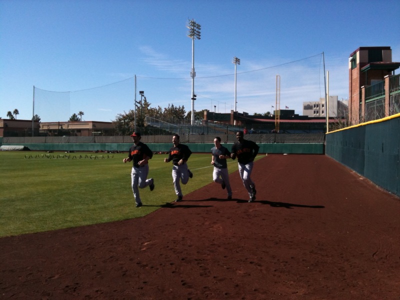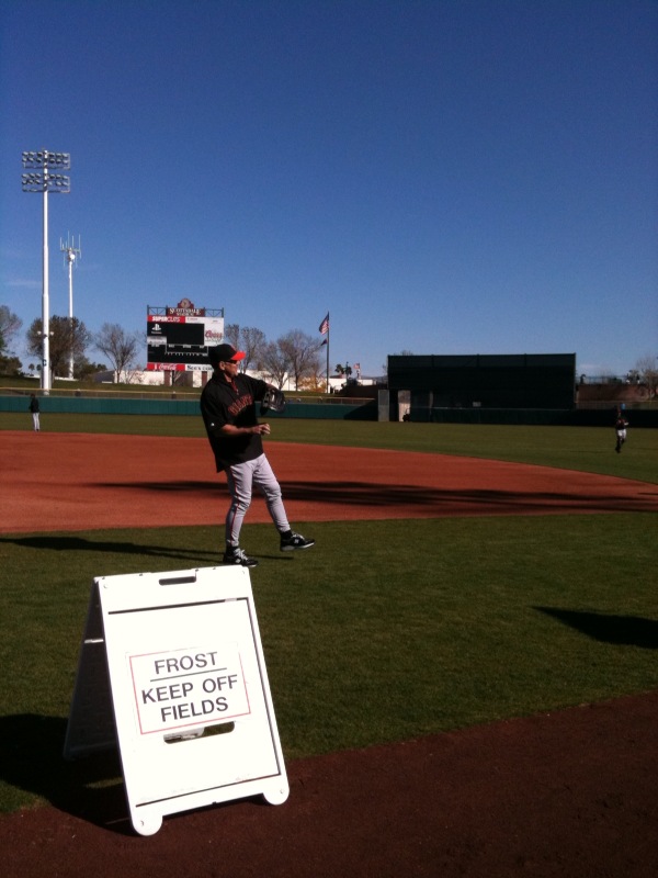 Today was the first official workout day for Giants pitchers and catchers here at Scottsdale Stadium. In past springs, manager Bruce Bochy would begin his workouts around 9:00am with players reporting to the stadium anywhere between 7:00-8:30. However, this season the workouts are starting an hour later at 10:00am to let the field dry out from the frost that covers the grass each morning. This is a big deal because it gives everyone (players, coaches, front office staff and media) an extra hour of sleep each night.
