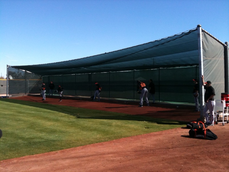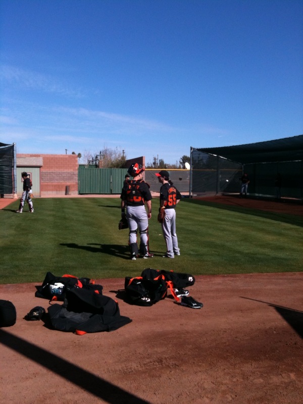After 10:00 hit, Bochy held a brief meeting with the team and then the players hit the field to warm up and loosen their arms. There are three fields at Scottsdale Stadium where the players rotate every 12 minutes or so working on throwing from the bullpen, fundamentals, bunting and PFP’s (pitcher’s fielding practice). The catching crew helps with the bullpens, get their defensive work in and then hit in the batting cage. Following the stations, 30 minutes of conditioning work is done led by Giants trainers and then by 12:30 the day’s complete. Bochy will meet with all the media to discuss the day’s events and players will shower, eat lunch and then go work on their golf game. Once the position players report on Friday the workouts will last a bit longer.