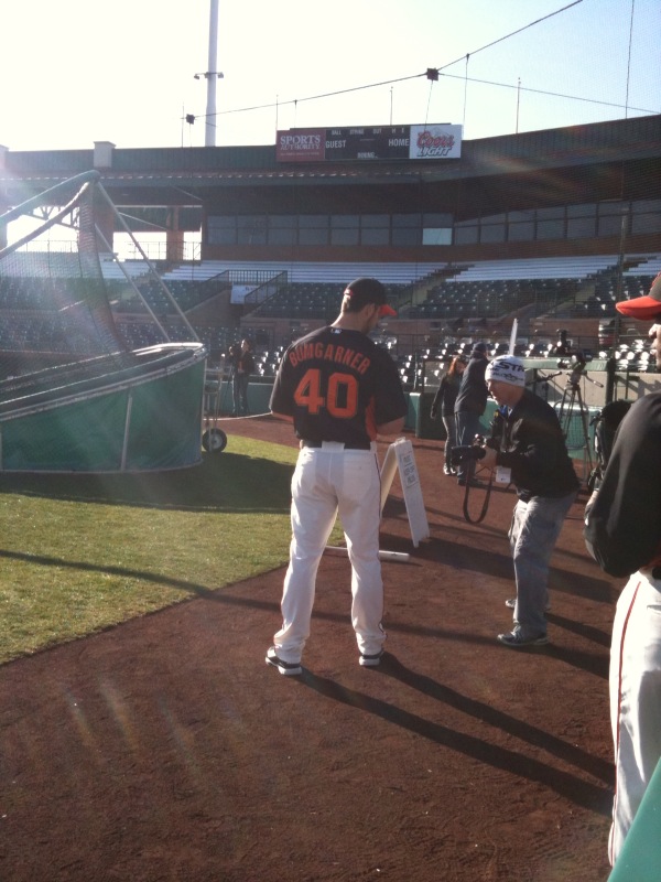 The clubhouse is also open to media starting at 8:30 so today several writers, columnists, and TV reporters were roaming around the clubhouse knocking out interviews. One thing about being the World Champions is that the media coverage grows and today is the perfect example as national writers from ESPN, USA Today, The Sporting News and cbssportsline.com were all in attendance. Baseball Tonight’s Spring Training Bus Tour parked in the centerfield lot early this morning as their first stop was Giants’ camp. Tim Kurkjian and John Kruk were on hand, interviewing players such as Cody Ross and Brian Wilson.