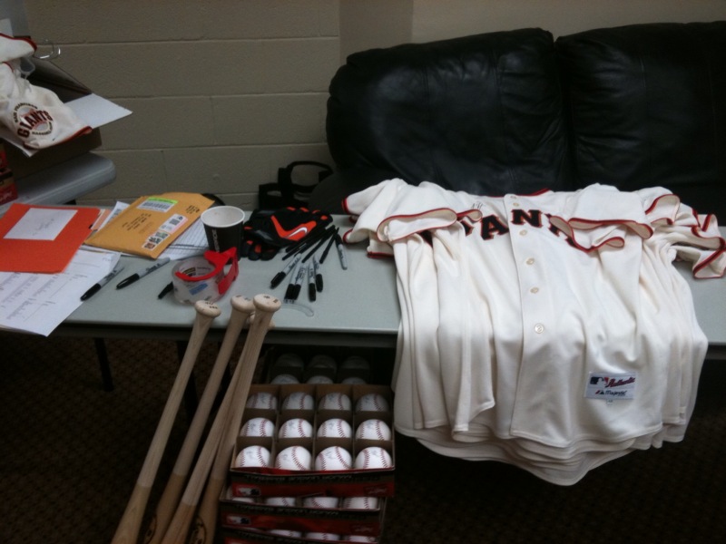 Every spring, front office staff members from the Giants’ Community Relations department fly down to Scottsdale and set up in a room in the home clubhouse where players come by and sign memorabilia, ranging from baseballs, bats, jersey’s and pictures. They receive a list of how much to send down from other departments within the Giants’ organization, as each department receives an allotment of autographed items to use for sponsors, community events, guest services, consumer marketing, baseball operations, etc.